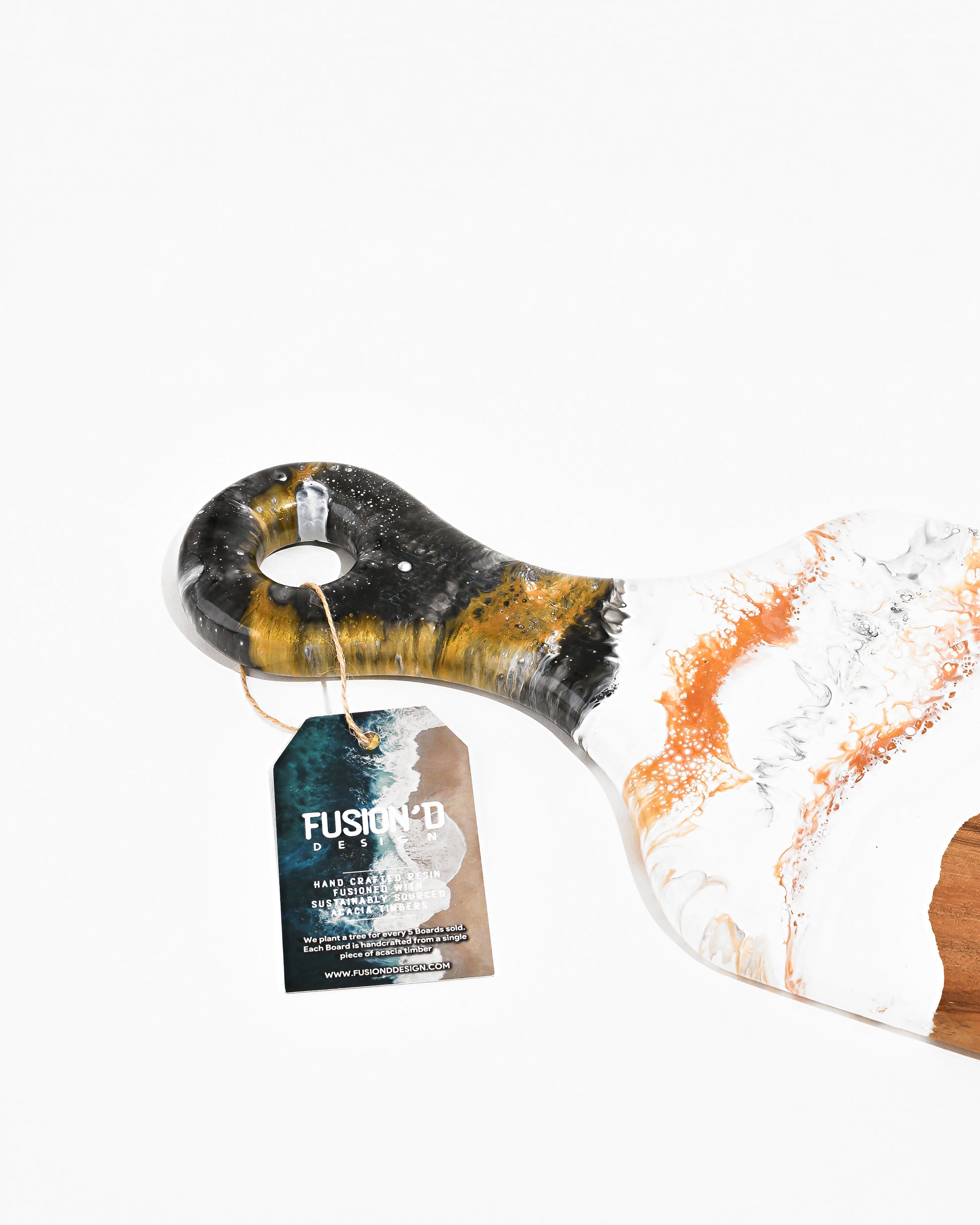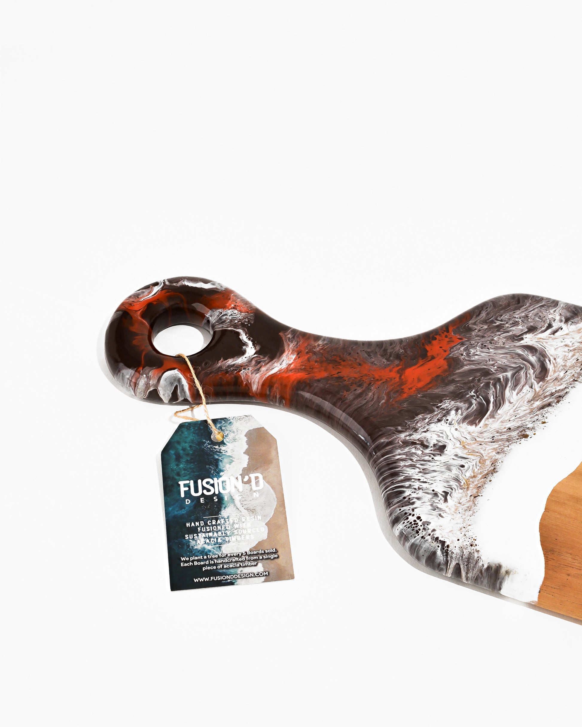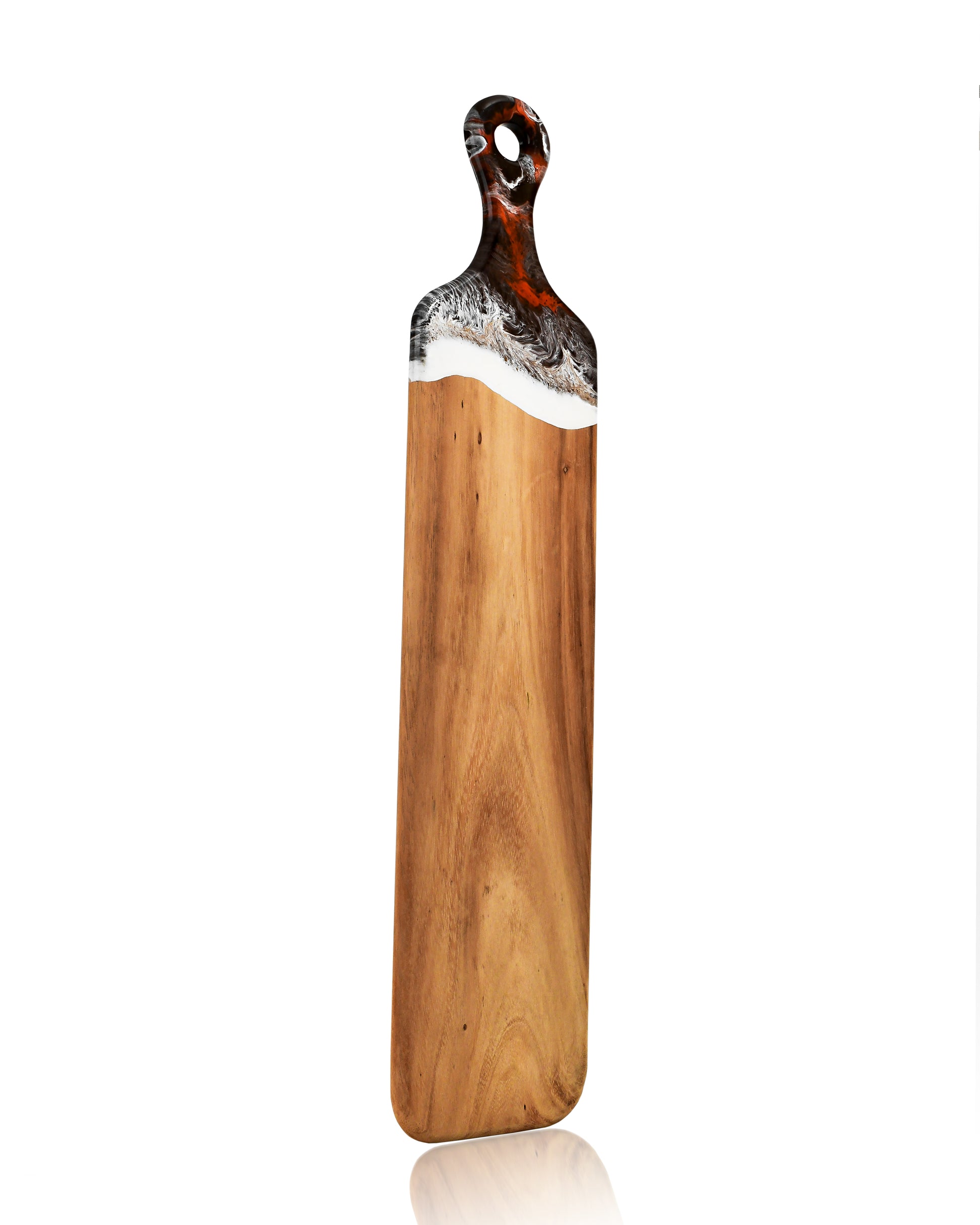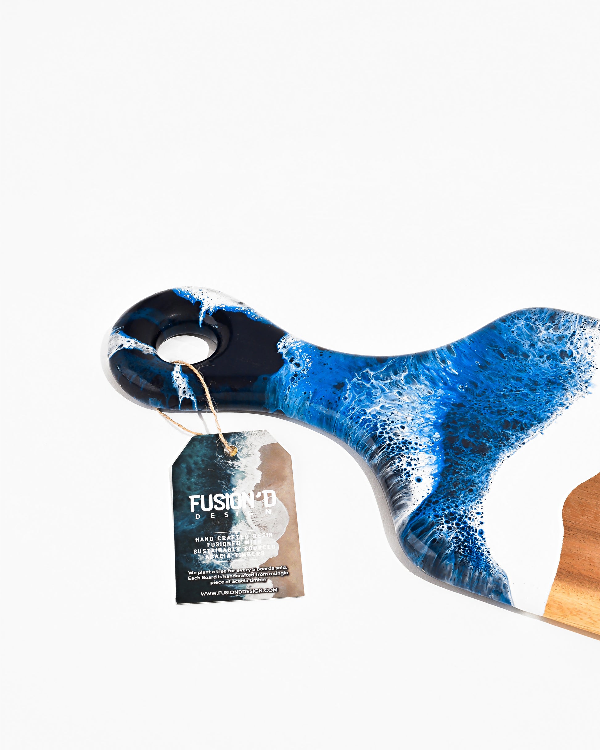 The striking resin detail is hand-poured using five layers of food-safe epoxy, forming a mesmerising movement of colour that is unique to every board. No two pieces will ever be identical.